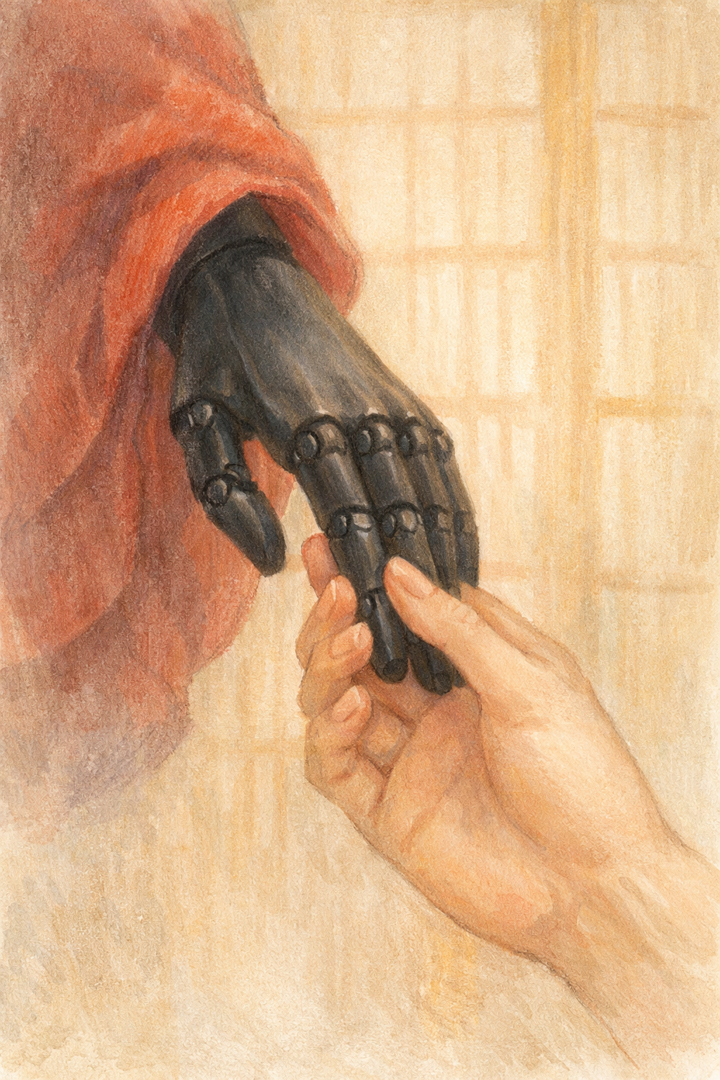 Around her raised platform, each human performer is paired with a robot performer, crossing wrists, practicing stances, and as the final pose is struck, the tall robot performer gracefully puts out an extended palm to her side; her welcoming gesture returned with warmth on her fingers.